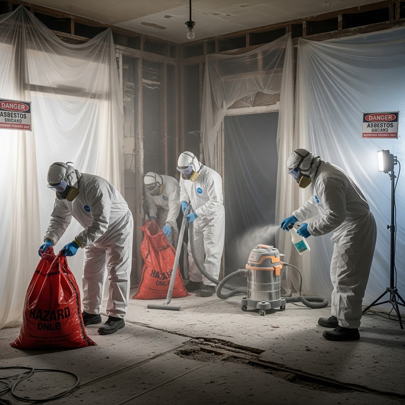 Certificerede fagfolk fjerner materialerne med specialudstyr og beskyttelsesdragter. 5. Rengøring og luftmålinger
